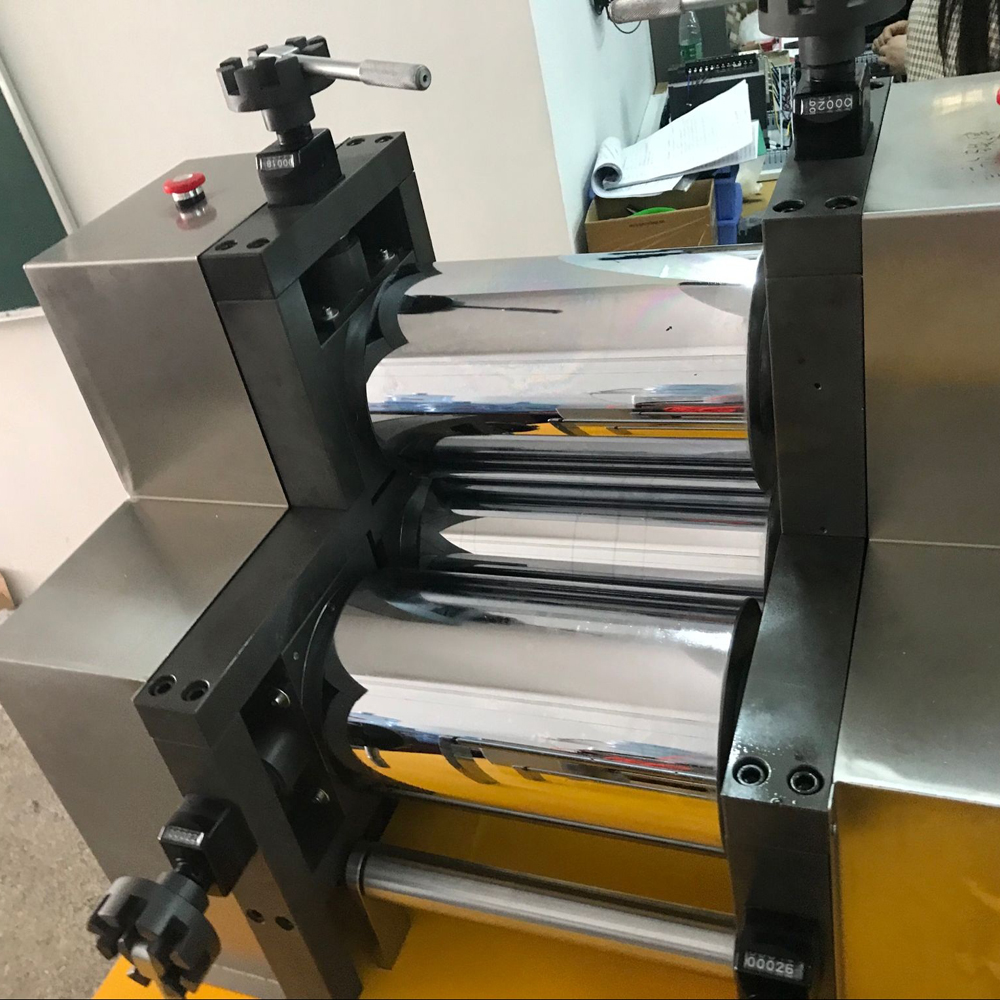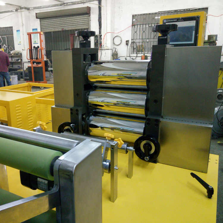 原理: 本機主要由主驅動電機、傳動裝置、擠出裝置、加料鬥、電控系統、流延模頭、兩輥壓延等組成.其工作原理為:物流從料斗裏放入經過擠出裝置的塑化和擠出變為流延狀態,再從主機經模頭出來,通過兩輥壓延機進行壓延。